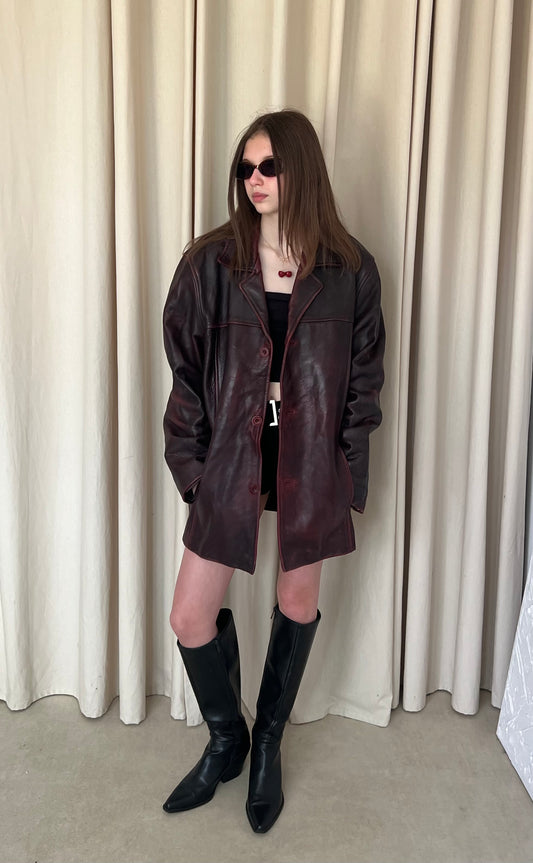 Kurtka ze skóry naturalnej z bordowymi przetarciami
