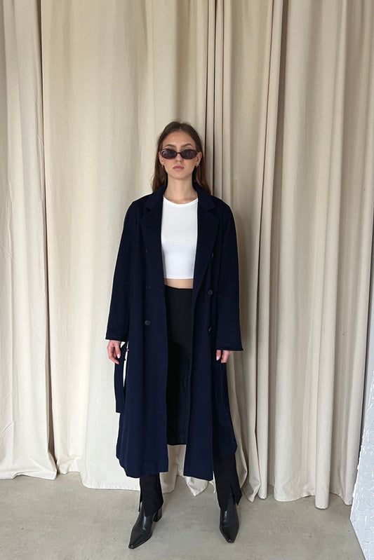 Wyprzedane WyprzedaneGranatowy 100% wełna płaszcz z paskiemCena regularna 350,00 zł PLNCena regularnaCena jednostkowa na-